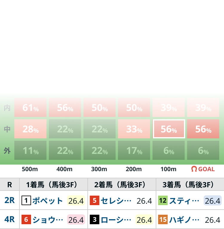 レース好条件の馬や調子が不安定な馬を一目で把握でき、予想の参考になります。